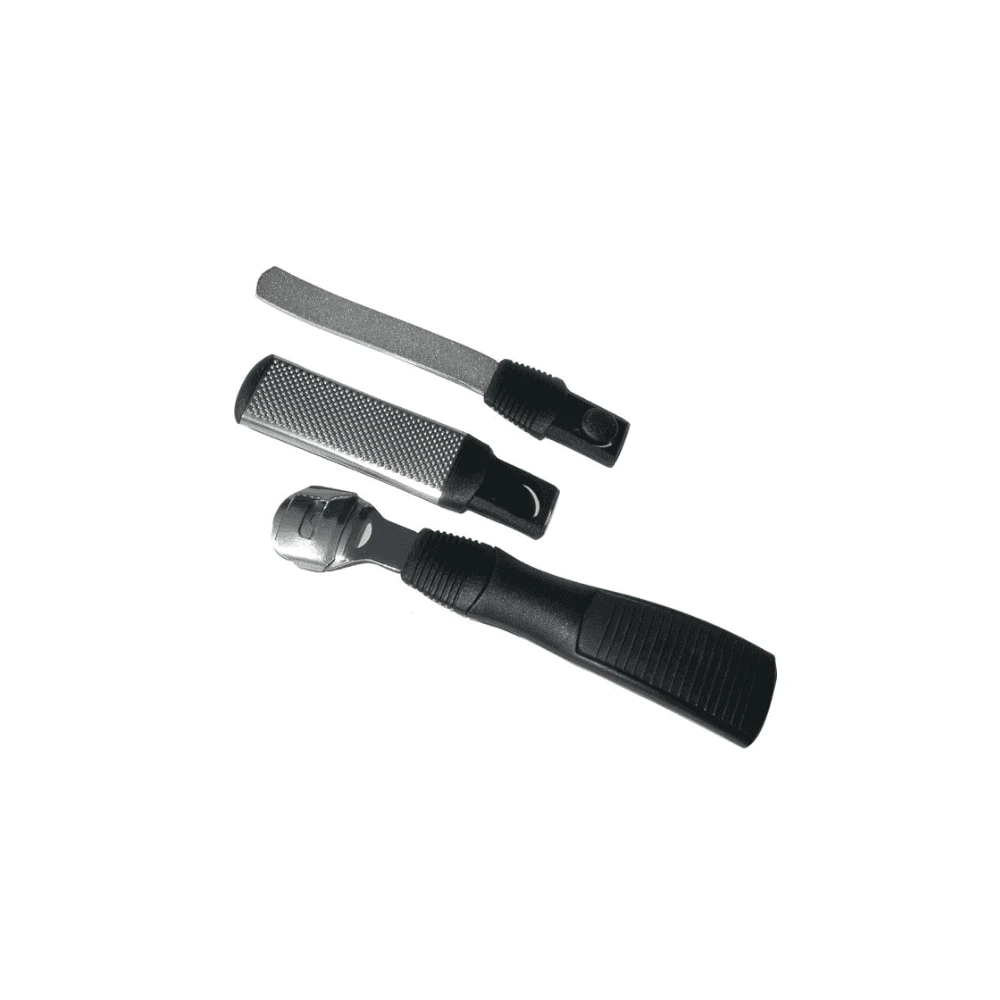 Includes three interchangeable heads covering all aspects of use in pedicures: corn shaver, rasp and foot file.