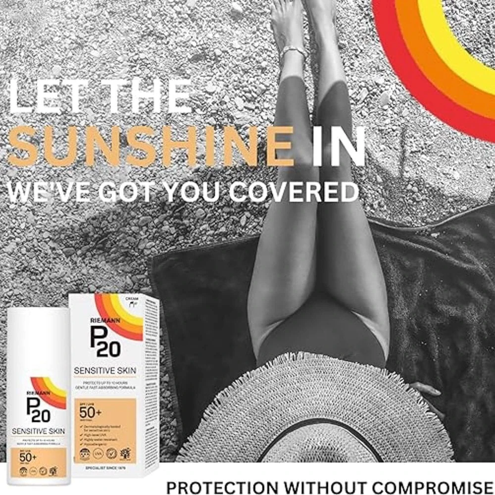 Riemann P20 SPF50+ Sensitive sun cream is dermatologically tested for sensitive skin and gives you the protection you expect from Riemann P20 in a light cream formula that is pleasant to the touch and gentle on the skin. Vegan friendly, EcoSun Pass approved, and Allergy Certified, this fast drying cream provides up to 10-hour protection, an EU very water resistant rating and at least twice Europe’s required UVA protection.